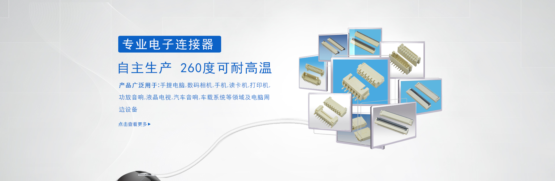 經營項目:FPC連接器、接插件、光纖連接器、FFC排線、端子線束等。間距有:0.3mm/0.5mm/0.8mm/1.0mm/1.25mm/1.5mm/2.0mm/2.54mm/3.96mm.......并可以為您開模定制各類精密連接器及配套線束.